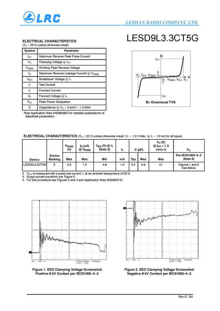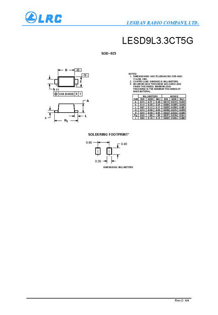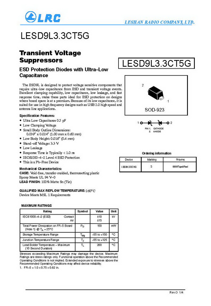 > LESD9L3.3CT5G VRM 3.3V VC 10V CJ 0.5pF SOD-923 LRC通用ESD保護二極管