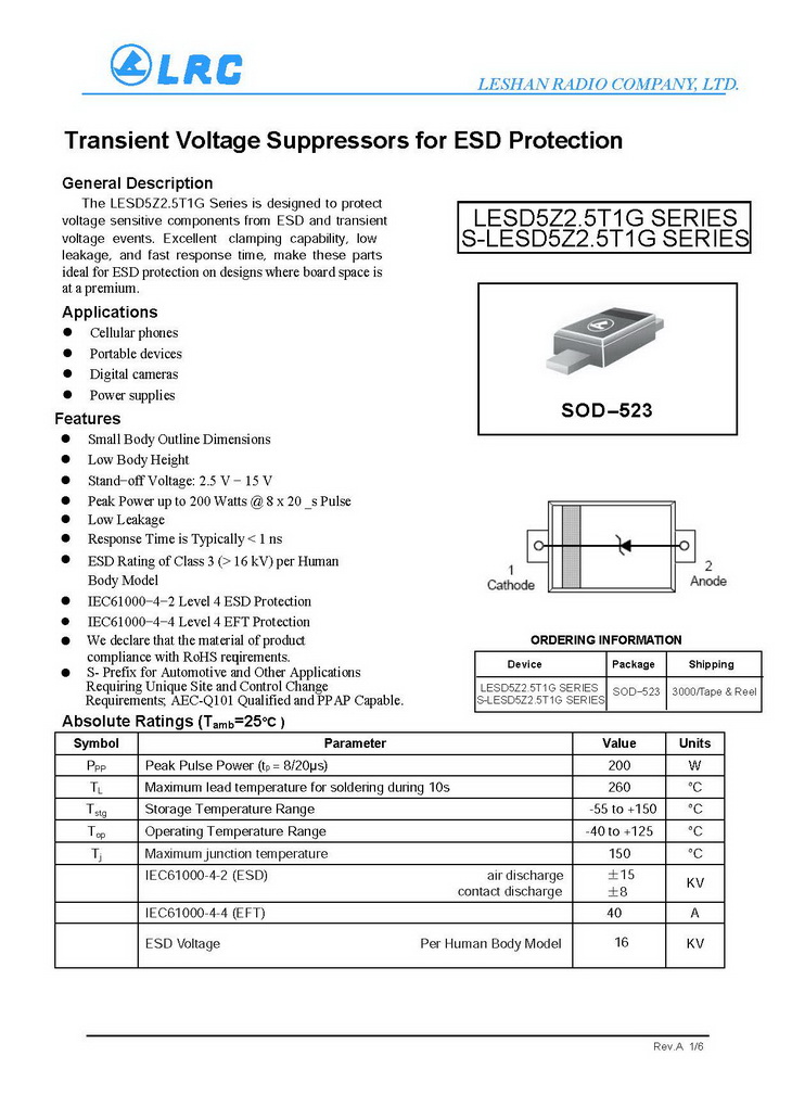 LESD5Z2.5T1G VRM 2.5V VC 10.9V CJ 145pF SOD-523 LRC通用ESD保護二極管