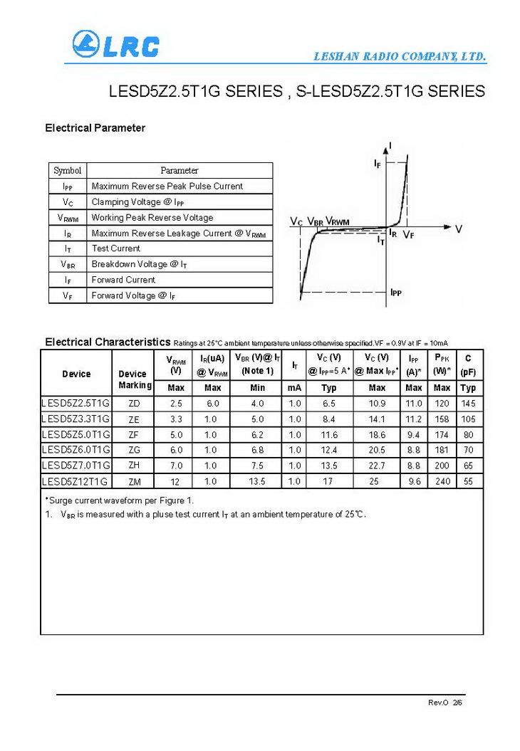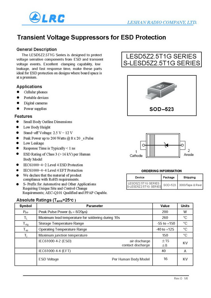 LESD5Z6.0T1G VRM 6V VC 20.5V CJ 70pF SOD-523 LRC通用ESD保護(hù)二極管