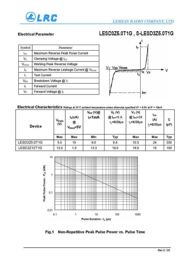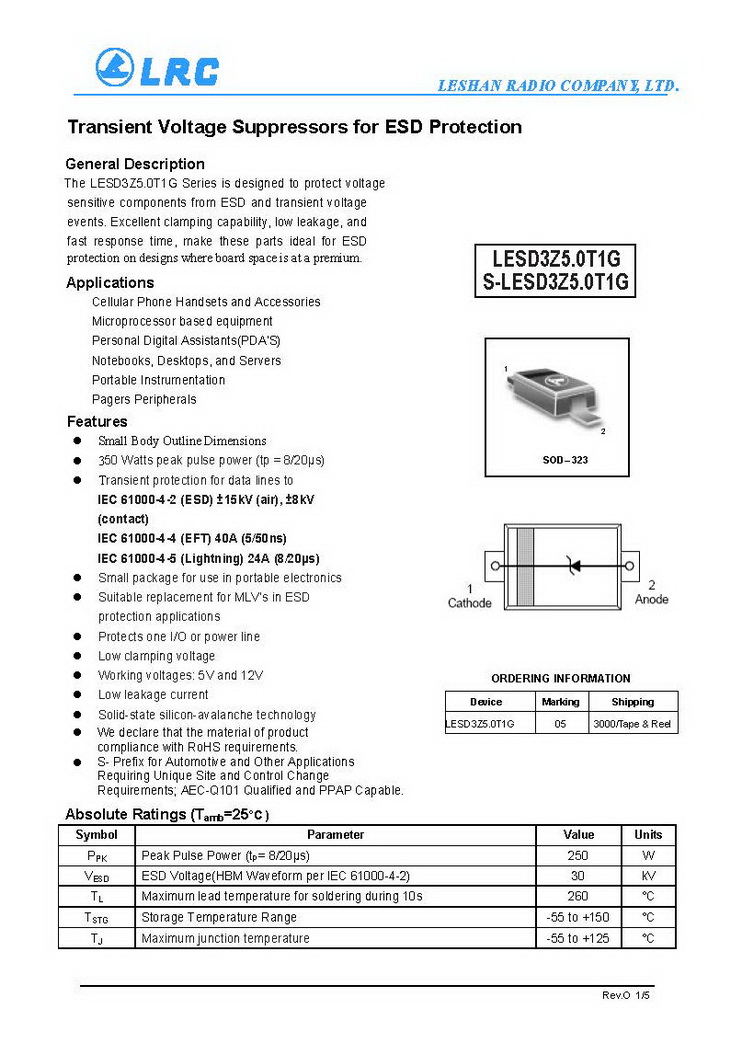 LESD3Z5.0T1G VRM 5V VC 9.8V CJ 350pF SOD-323 LRC通用ESD保護二極管
