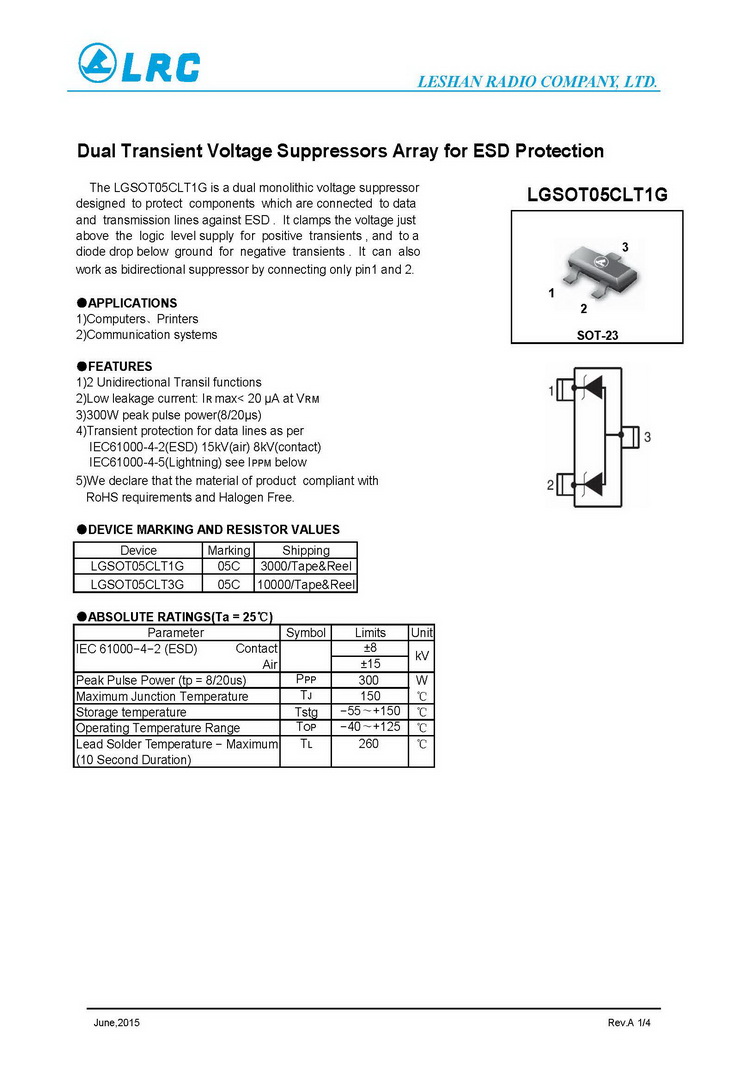 > LGSOT05CLT1G VRM 5V VC 9.8V CJ 220pF SOT-23 LRC通用ESD保護二極管
