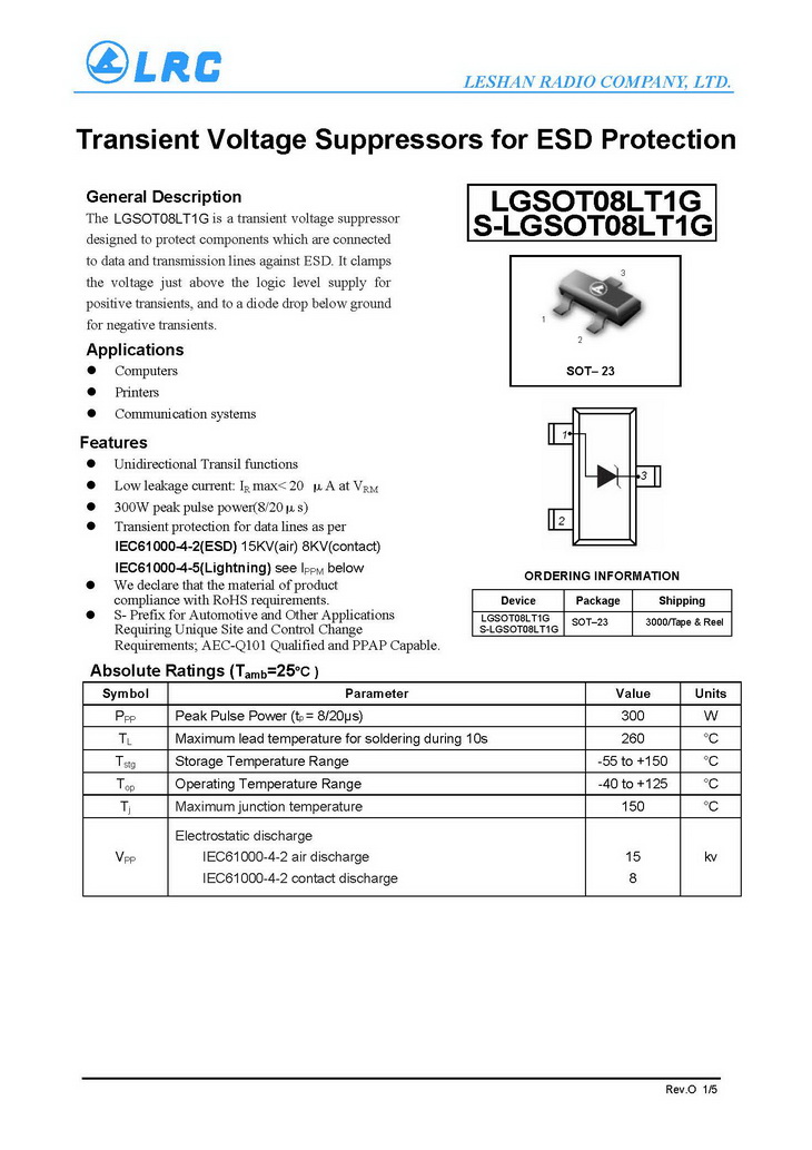 > LGSOT08LT1G VRM 8V VC 13.4V CJ 190pF SOT-23 LRC通用ESD保護二極管