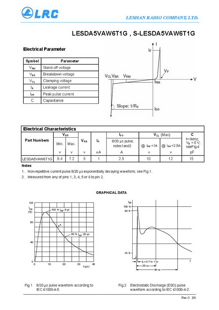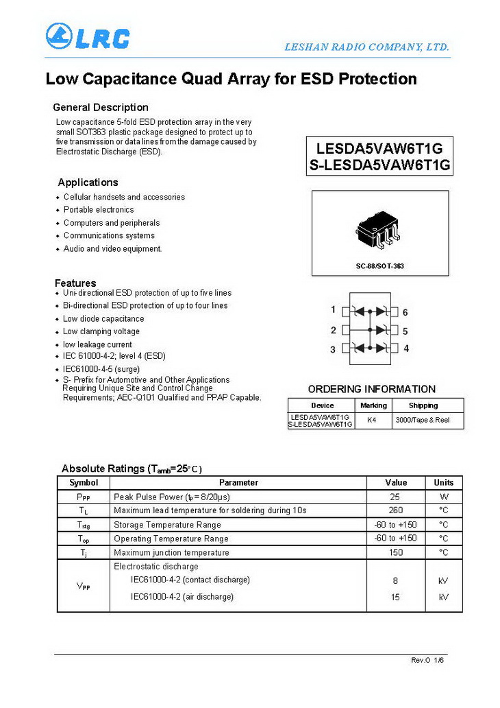 > LESDA5VAW6T1G VRM 5V VC 10V CJ 15pF SC-88 LRC通用ESD保護二極管