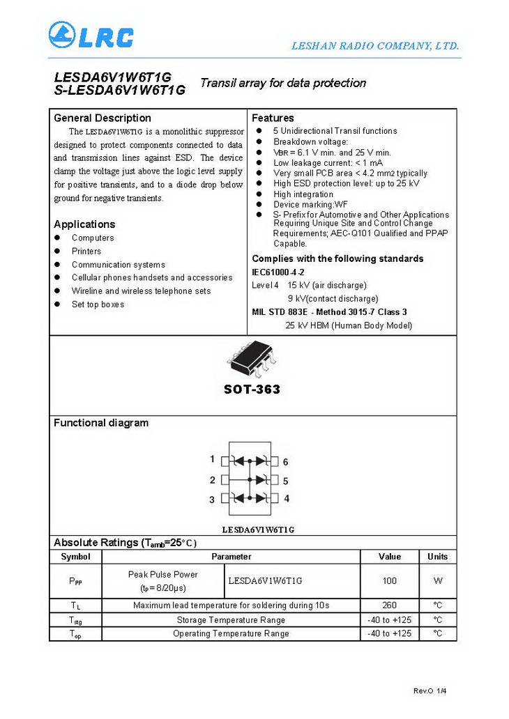 > LESDA6V1W6T1G VRM 5V VC 10V CJ 50pF SC-88 LRC通用ESD保護二極管