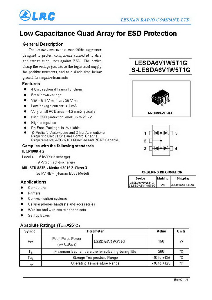 LESDA6V1W5T1G VRM 5V VC 10V CJ 90pF SC-88A LRC通用ESD保護二極管