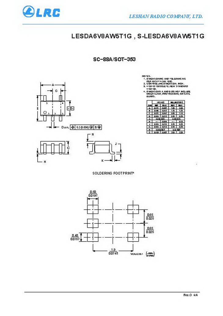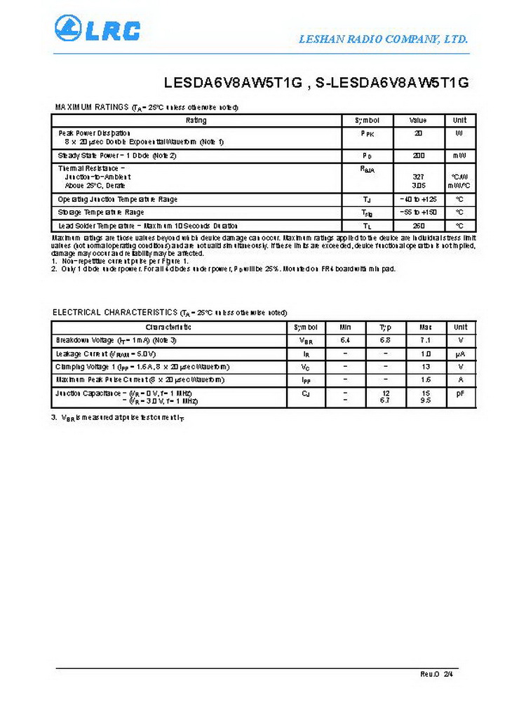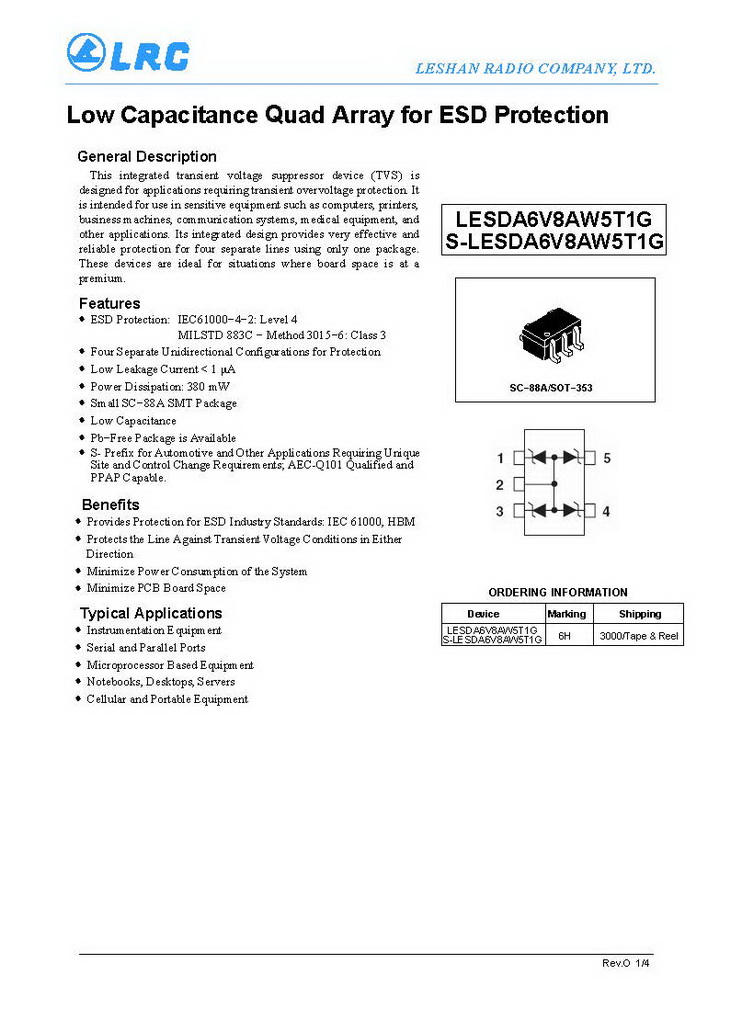 > LESDA6V8AW5T1G VRM 4.3V VC 13V CJ 12pF SC-88A LRC通用ESD保護二極管