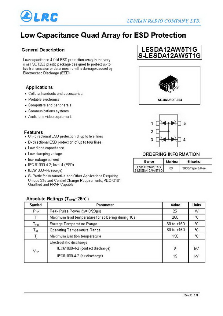 > LESDA12AW5T1G VRM 12V VC 13V CJ 15pF SC-88A LRC通用ESD保護二極管