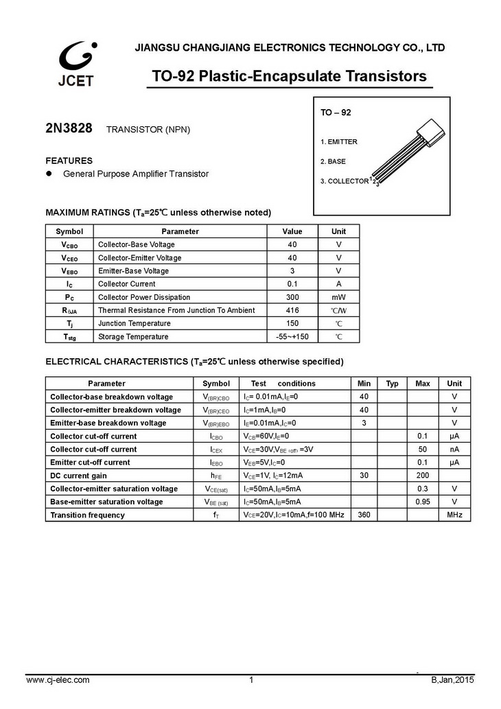 > 2N3828 NPN 300mW IC=100mA BVCBO=40V TO-92 長電 通用放大器晶體管