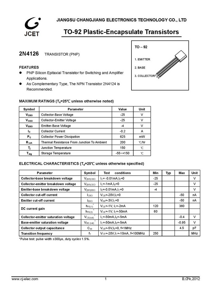 2N4126 PNP 625mW IC=200mA BVCBO=25V TO-92 長電 開關(guān)放大器晶體管