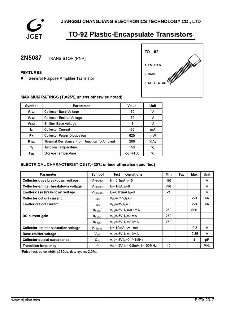 2N5087 PNP 625mW IC=50mA BVCBO=50V TO-92 長電 通用放大晶體管