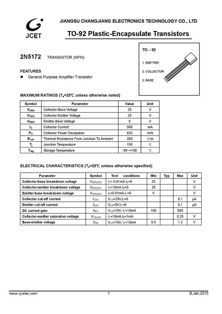 2N5172 NPN 625mW IC=500mA BVCBO=25V TO-92 長電 通用放大晶體管