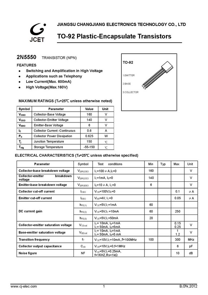 2N5550 NPN 625mW IC=600mA BVCBO=160V TO-92 長電 開關高壓放大晶體管