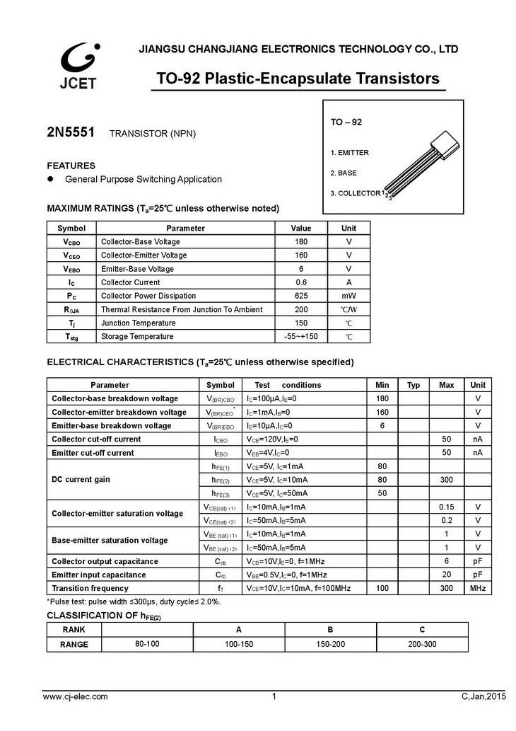 2N5551 NPN 625mW IC=600mA BVCBO=180V TO-92 長電 開關高壓放大晶體管