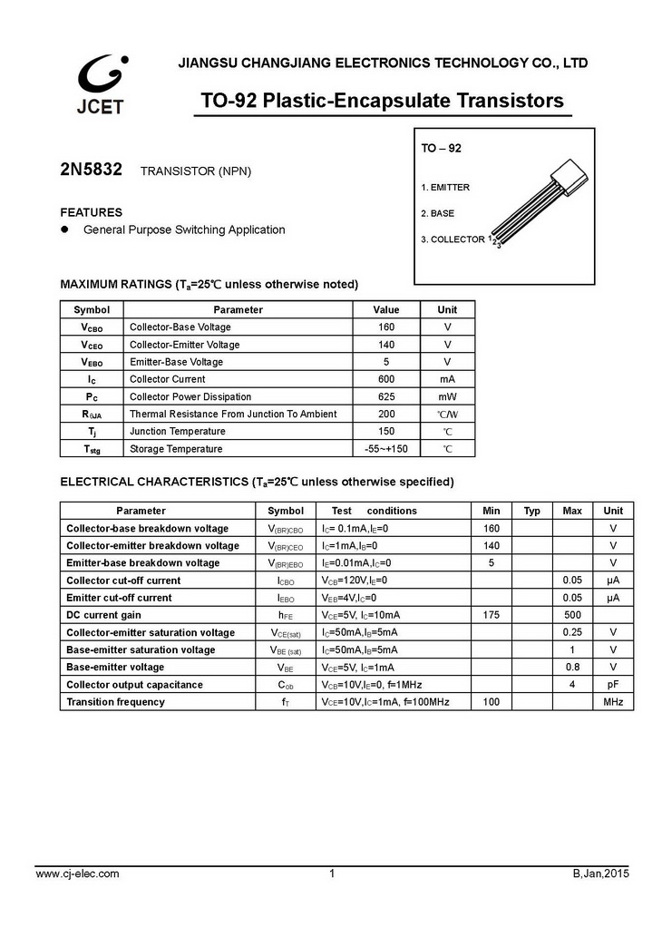 2N5832 NPN 625mW IC=600mA BVCBO=160V TO-92 長電 開關高壓放大晶體管