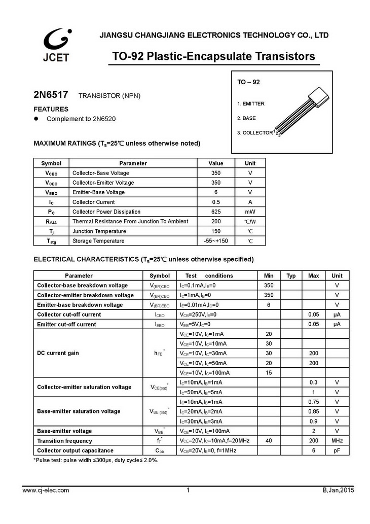 2N6517 NPN 625mW IC=500mA BVCBO=350V TO-92 長電 開關高壓放大晶體管