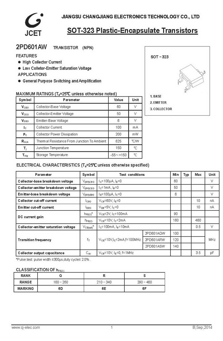 2PD601AW NPN 200mW IC=100mA BVCBO=60V SOT-323長(zhǎng)電 開(kāi)關(guān)放大晶體管