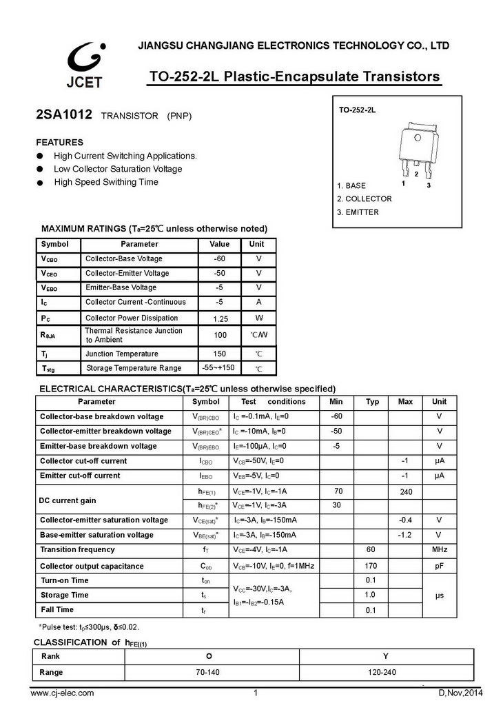 2SA1012 PNP 1250mW IC=5000mA BVCBO=60V TO-252-2L(4R)長電 開關放大晶體管