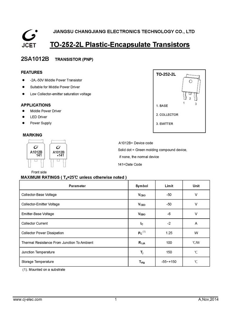 2SA1012B PNP 1250mW IC=2000mA BVCBO=50V TO-252-2L(4R)長電 開關(guān)放大晶體管