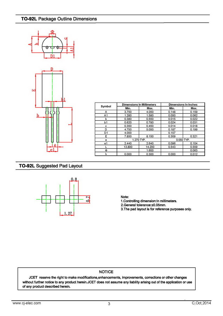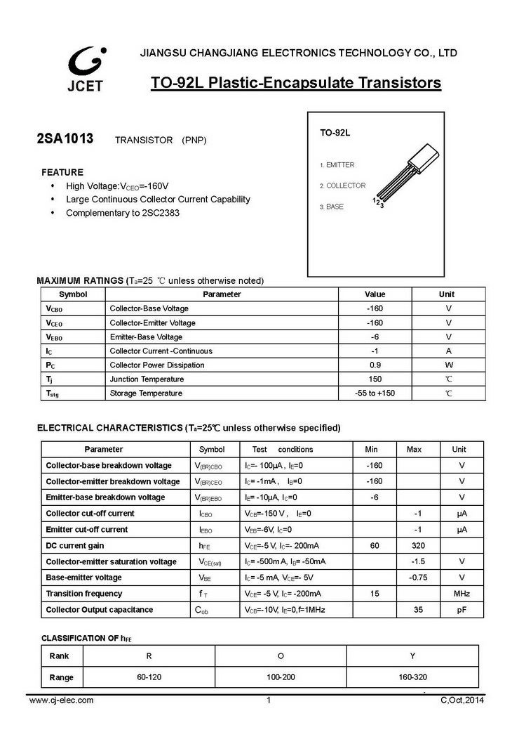 2SA1013 PNP 900mW IC=1000mA BVCBO=160V TO-92L 長電 開關放大晶體管