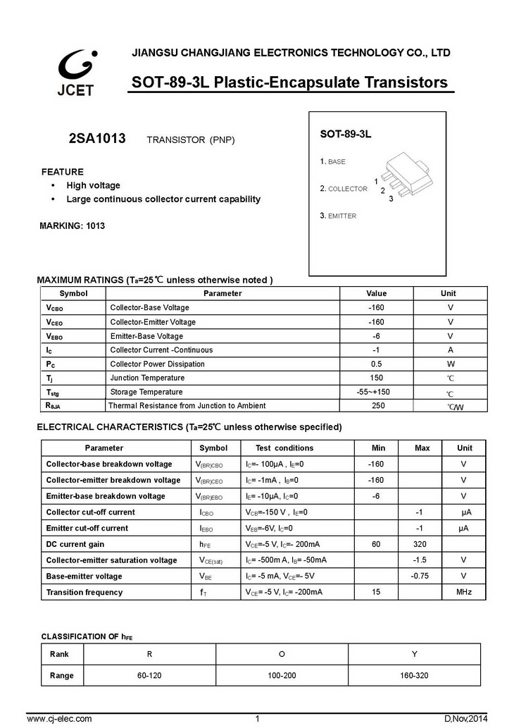 > 2SA1013 PNP 500mW IC=1000mA BVCBO=160V SOT-89-3L 長電 開關放大晶體管