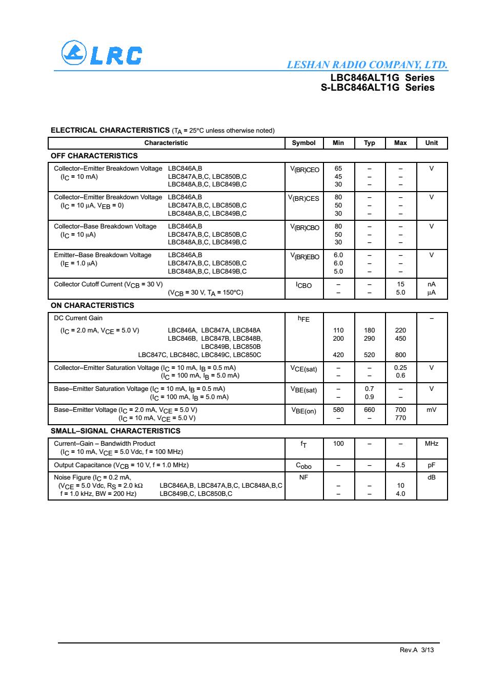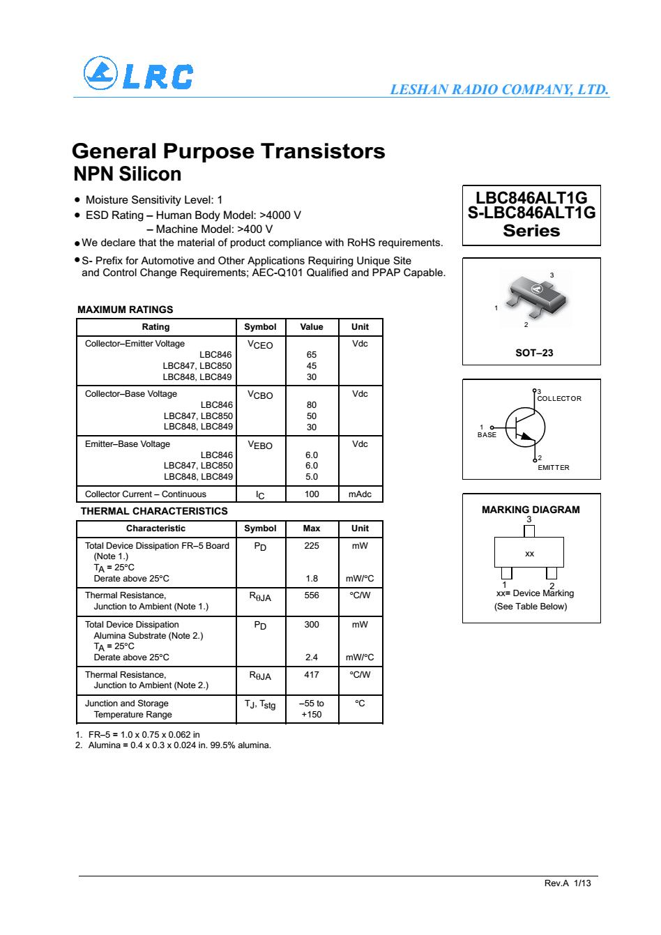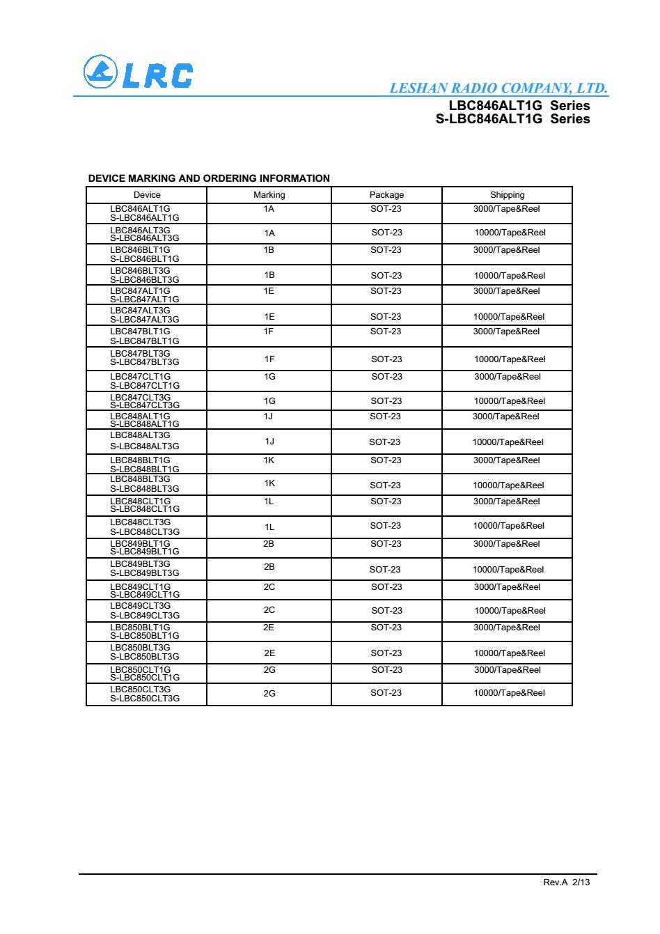 > LBC850CLT1G SOT-23 NPN LRC 三級管