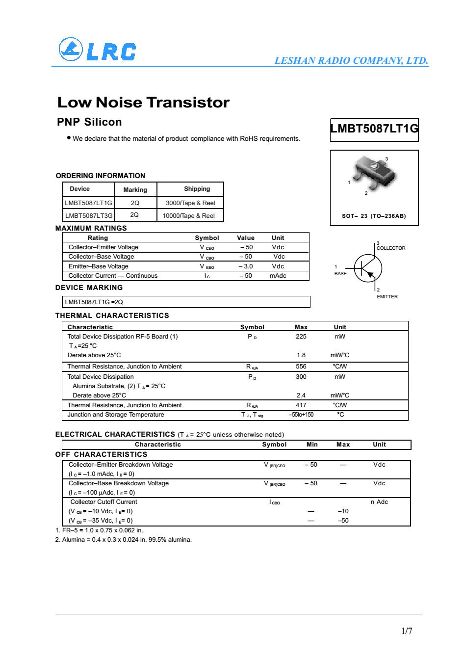 > LMBT5087LT1G SOT-23 PNP LRC三級管